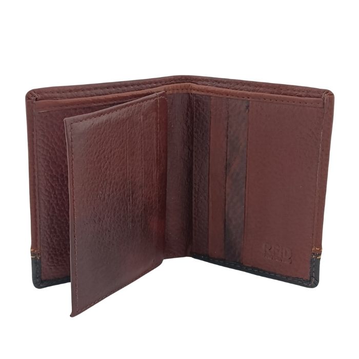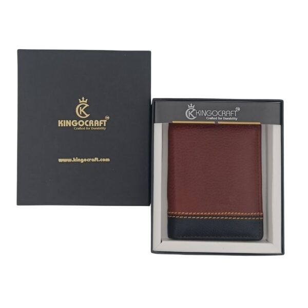 The KingoCraft KingoCraft RFID-protected Tri-Fold Leather Wallet designed for men It is a great blend of practicality and elegance. It is designed for modern gentlemen who wish to carry more, but not sacrifice on design This wallet is constructed of premium genuine leather. It features a deep brown color with black border details and contrast stitching to create an exquisite style.
